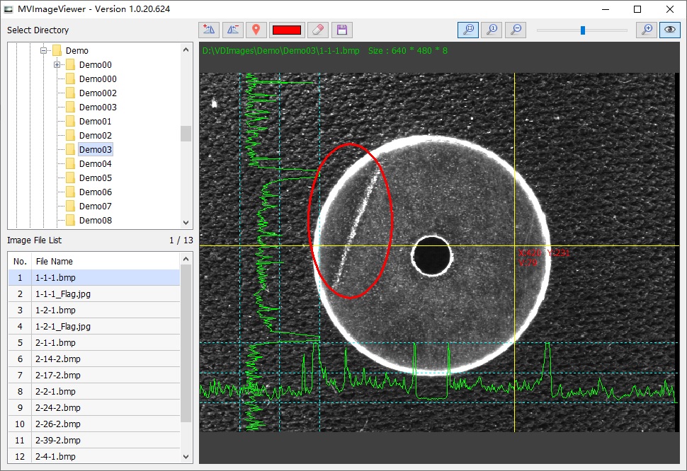 MVImageViewer 该软是一款面向工业自动化机器视觉领域的图像浏览器, 其主要技术特点如下: 1)支持工业机器视觉邻域超大图像浏览,图像最大支持图像尺寸65535 x 65535; 2)支持机器视觉领域常见的图像格式,包括JPG、BMP、PNG、TIF和易渊图像自定义RAW格式; 3)支持任意调整图像显示缩放比例;支持图像90度旋转; 4)支持通过鼠标查看图像上像素信息; 5)支持图像圈注然后自动保存原文件名+Flag后缀的圈注图像。